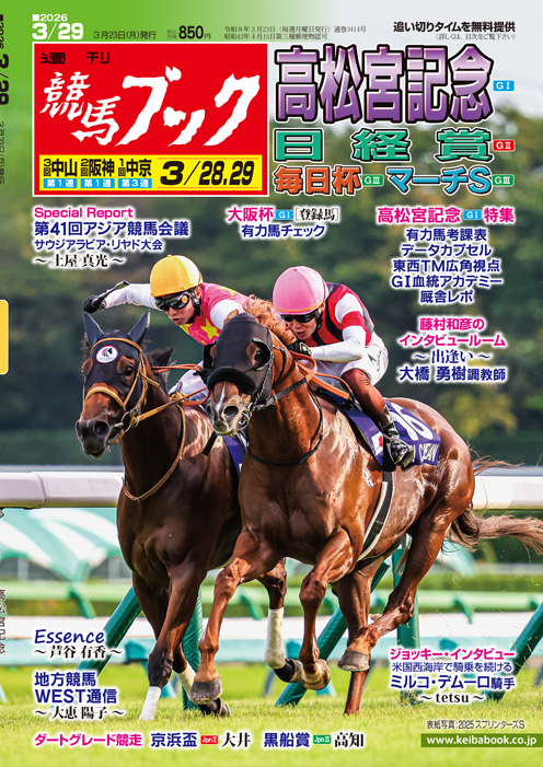 天皇賞(春)へとつながる阪神大賞典は中団を進んだアドマイヤテラが2周目3〜4角から少しずつ前との差を詰め、先団直後で4角を回ると直線で鮮やかに抜け出して、2着アクアヴァーナルに3馬身の差をつけた。3歳時は菊花賞3着、4歳春に目黒記念勝ちと段階を踏んで力をつけてきた大器が、5歳を迎えて完成に近づいたようだ。ファルコンSは朝日杯FS2着のダイヤモンドノットが完勝し、愛知杯はアイサンサンが逃げ切り、フラワーCはスマートプリエールが直線鋭く伸びて差し切った。今週は春のスプリント王決定戦となる第56回高松宮記念をはじめ、日経賞、毎日杯、マーチSの4重賞。